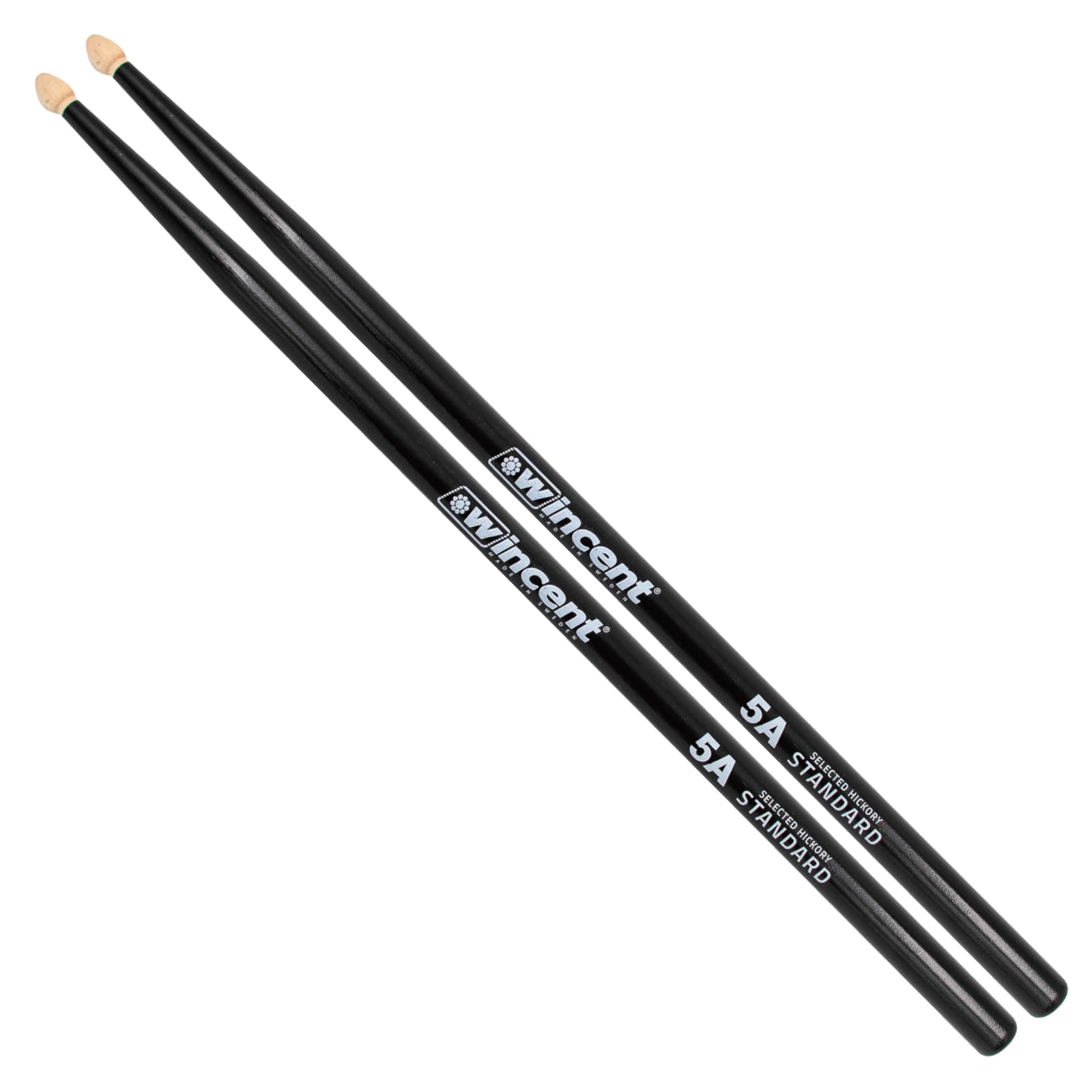 Wincent 5A Natural Hickory Black Wood Tip W-5ACB. The Wincent Hickory 5A Natural Drumsticks, Black are ideal for light and fast players looking for the Wincent reliability and performance. These anti-split sticks have a unique wax coating for protection and the US Hickory is kiln dried to the perfect level for maximum durability. The 5A shape provides versatility for any genre or playing style - there is a reason why 5A is the standard go-to size! These stylish black drumsticks deliver more power and greater reach for players looking to expand their playing.